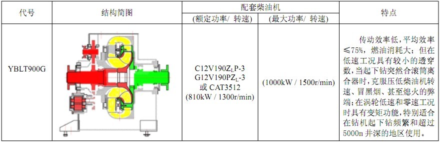 1985年研制成功的YBLT900型離心變矩器,取代從國外進(jìn)口的原CHC750型變矩器。而 YBLT900型變矩器為單級渦輪變矩器,在循環(huán)圓內(nèi)布置泵輪、渦輪和導(dǎo)輪各一個。采用間隙密封,軸承齒輪的潤滑與變矩器的工作油均為同一種油。與原CHC750變矩器相比,具有較高的效率、使用可靠、壽命長和維護(hù)方便等優(yōu)點,近十多年來,與12V190和CAT3512等型柴油機匹配,應(yīng)用在國產(chǎn)ZJ40~70L型鉆機上,作為柴油機與并車鏈條箱之間的傳動裝置,得到了廣泛的應(yīng)用。2009年我公司對該型號變矩器進(jìn)行了改進(jìn),形成了YBLT900G改進(jìn)型離心變矩器,其結(jié)構(gòu)特點是:①.采用沿軸心線水平分箱的鋼板焊接箱體,取代原變矩器分為左、中、右垂直分箱的鑄造箱體,克服了原變矩器垂直分箱面及鑄造缺陷造成的易漏油缺點,同時使得變矩器的裝拆更加容易,方便了現(xiàn)場的維護(hù);②.供油泵及其進(jìn)入油冷卻的管線均布置在箱體內(nèi),取消了橡膠軟管線,提高了油管路使用的可靠性;③.焊接箱體改善了外觀質(zhì)量;④.改進(jìn)型與原型變矩器的安裝尺寸完全相同,兩者可以進(jìn)行互換。