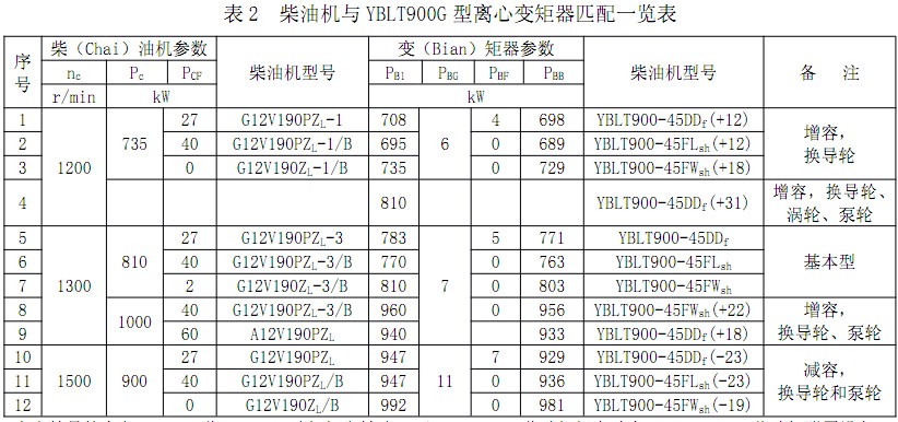 ● 柴油機與YB900G離心變矩器匹配一覽表