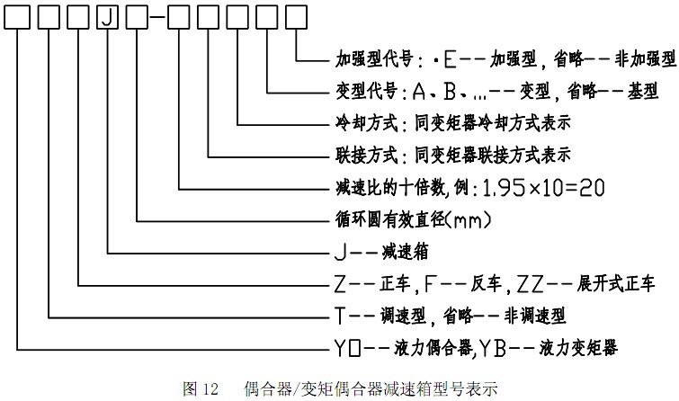 標記示例:液(Ye)力偶(Ou)合器減(Jian)速箱為調(diào)(Tiao)速型,偶合器各傳動軸的排列方式為展(Zhan)開式,輸出軸的轉(zhuǎn)向與輸入軸的轉(zhuǎn)向相同為正(Zheng)車,其工作腔直徑為750 mm,其減速箱的減速比為2.73(四舍五入為2.7),偶合器通過法(Fa)蘭與柴油機輸出的聯(lián)軸器相連接,用風扇散熱器冷卻偶合器工作油[獨(Du)立風(feng)扇冷卻],加強(Enhancive)型設(shè)計。則型號標記為:YOTZZJ750-27FDf•E。
